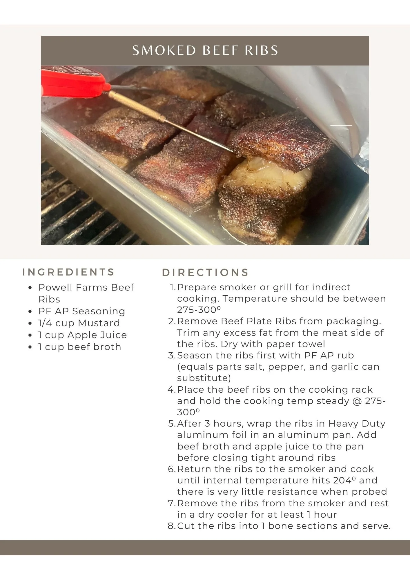 This is a great way to use those beef ribs you bought from Powell Farms and aren’t sure what to do with. These can be smoked on a regular grill, a pellet grill (which is what we use) or in your oven. You won’t get the smoke flavor in your oven but still an option if you don’t have a grill.
